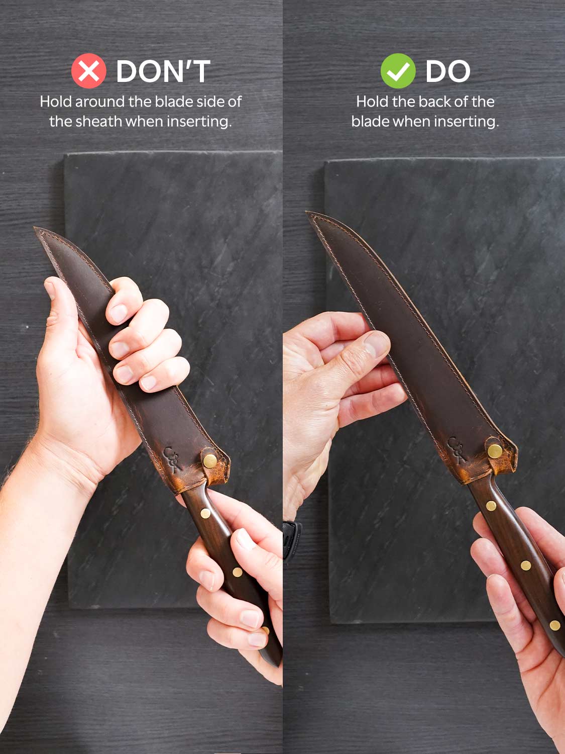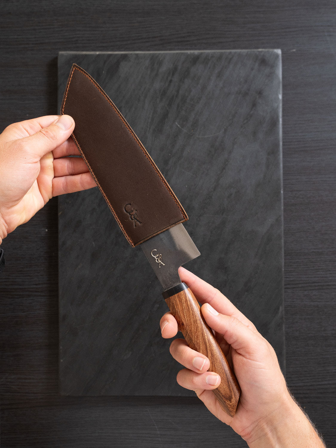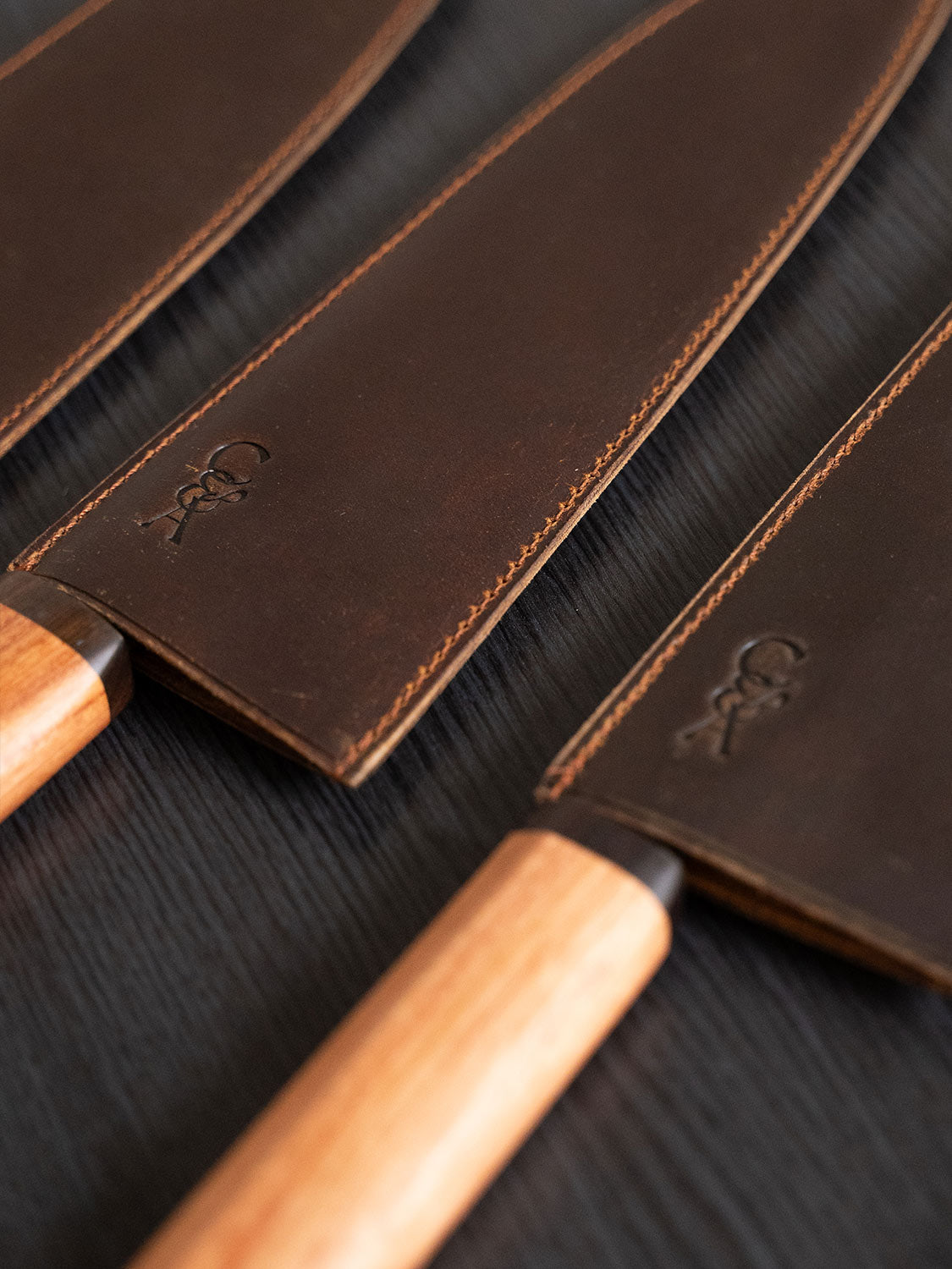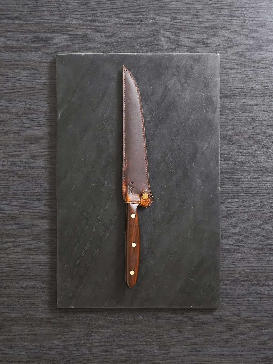The best thing you can do for a carbon steel knife is protect it. Premium buffalo leather. Custom cut for each knife in the range. Tight stitching. Snug fit. Built to keep your blade safe when it's not in your hand.