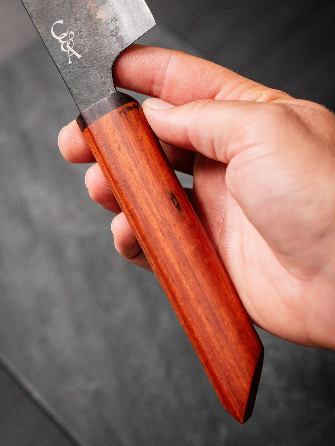 Padauk. Padauk is a strong hardwood known for its rich colour and toughness. It has a natural reddish tone that darkens beautifully over time. Because it’s dense and durable, Padauk makes a great knife handle. It holds up to everyday use, feels solid in your hand, and looks better the more you use it. It’s a mix of strength, beauty, and comfort.