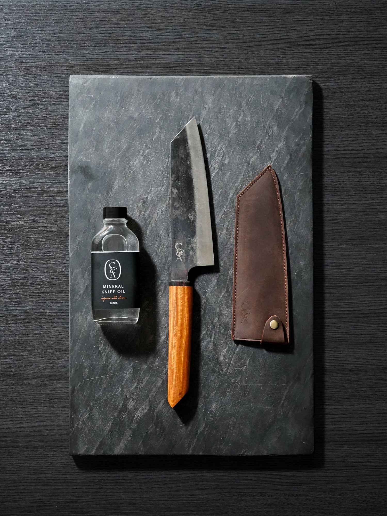 Dry your knife after each use to prevent rust. Oil the carbon steel using a food grade mineral oil. Avoid soaking & never put it in the dishwasher. For full care tips, visit: Knife Care Guide →
