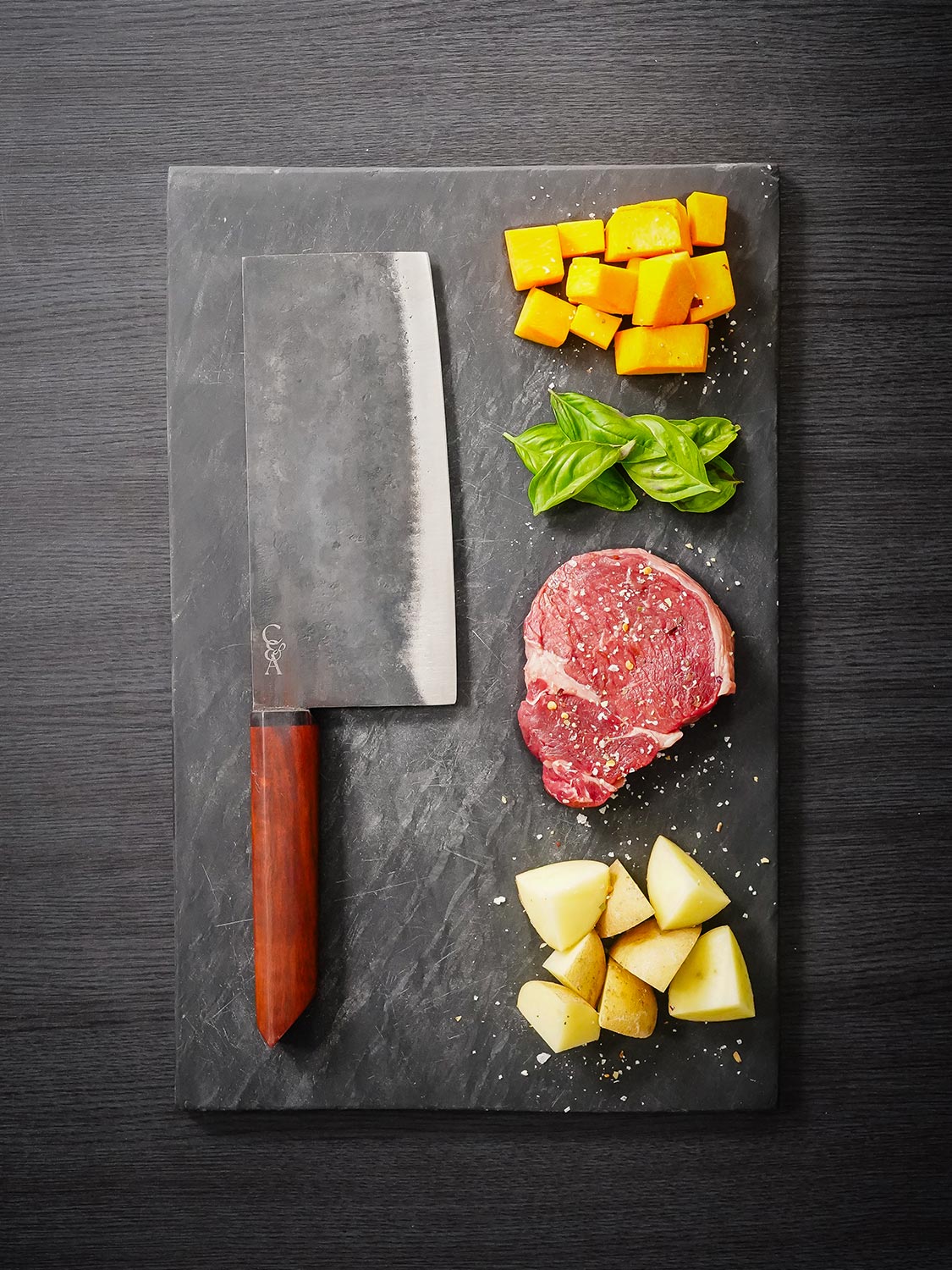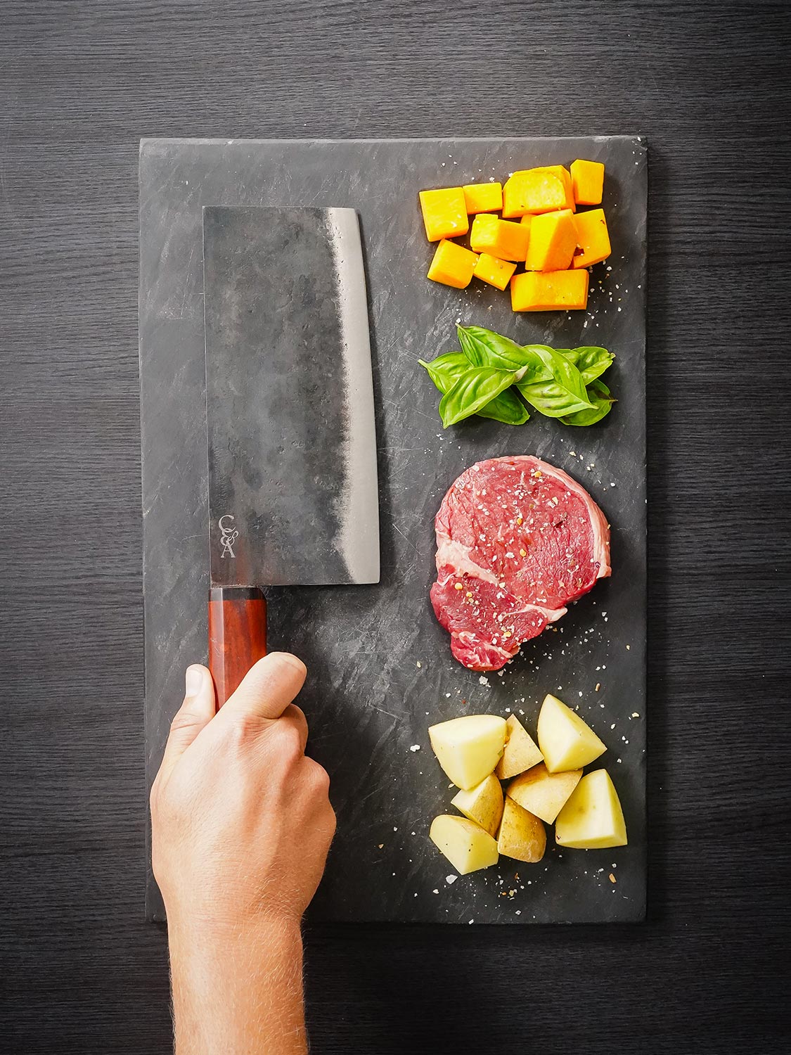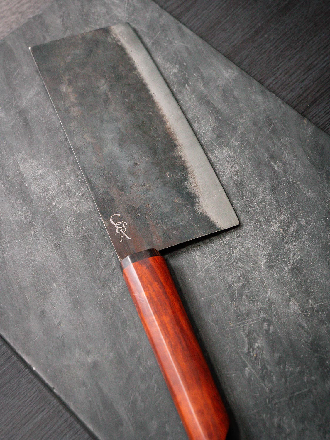 Goliath draws from the classic Chinese-style cleaver. Rethought for modern home cooking. Its wide blade gives you space and weight, and the flat profile makes it ideal for straight, forceful chopping. Despite its size, it’s surprisingly easy to handle. Perfect for those moments when precision meets power.