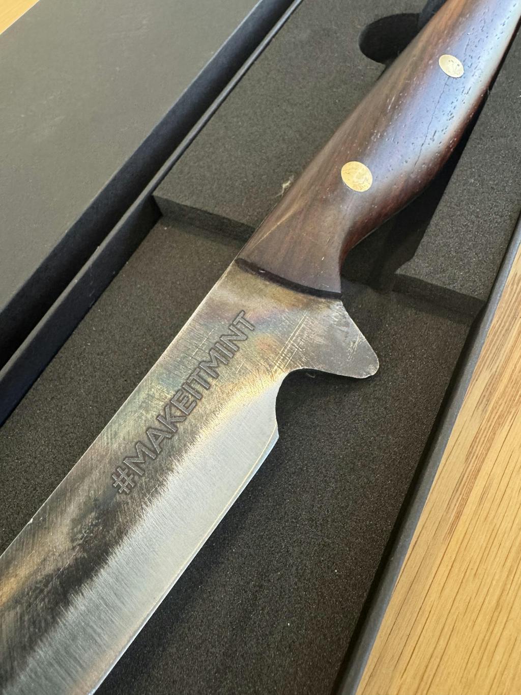 Padauk. Padauk is a strong hardwood known for its rich colour and toughness. It has a natural reddish tone that darkens beautifully over time. Because it’s dense and durable, Padauk makes a great knife handle. It holds up to everyday use, feels solid in your hand, and looks better the more you use it. It’s a mix of strength, beauty, and comfort.