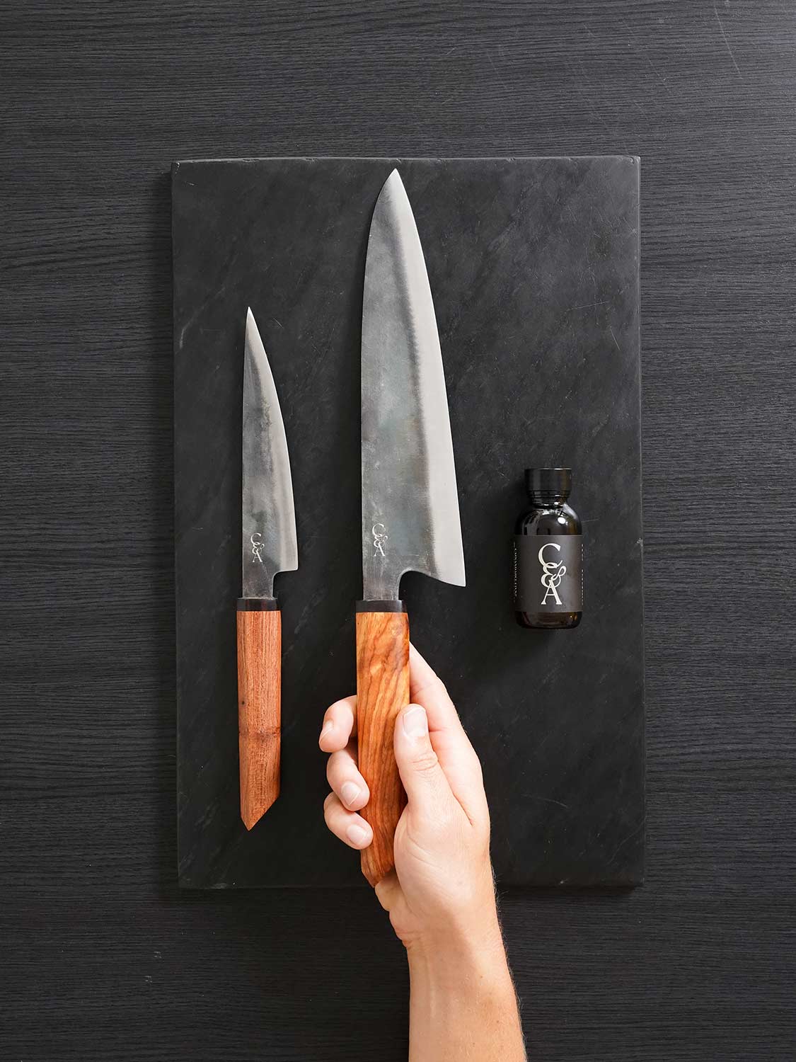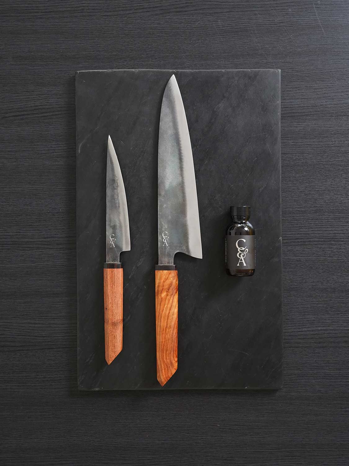 A powerful pairing for cooks who want range. Judas brings a sweeping 24cm Gyuto blade for the big jobs. Slicing roasts, chopping through cabbage, dicing with momentum. Jonathan steps in for the detail work. Trimming, peeling, prepping herbs and finishing with precision. Together, they give you everything from heavy prep to fine cuts. Completed with a Mineral Oil for the best knife care.