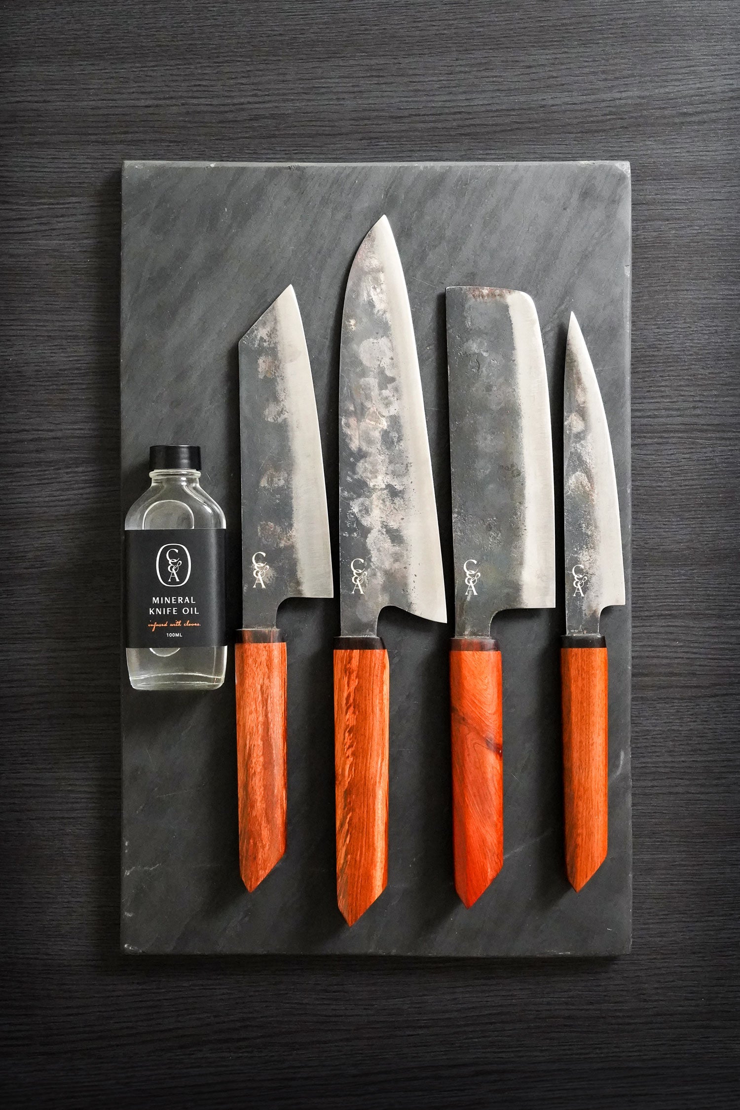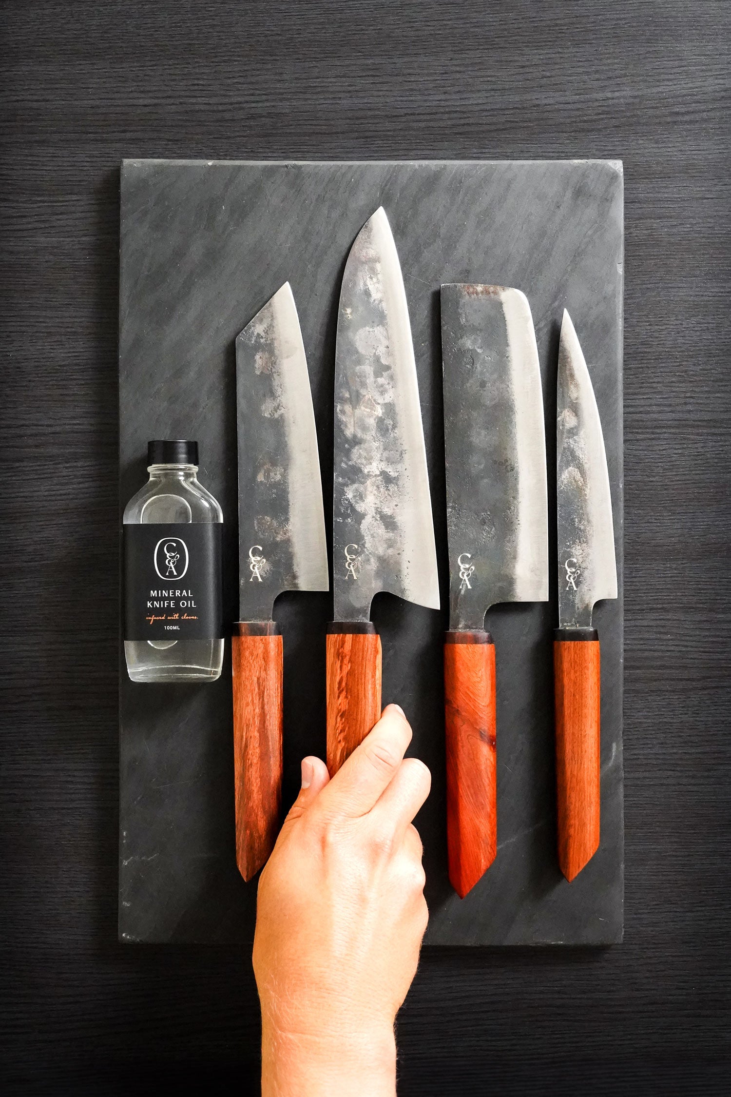 Our extensive set of kitchen knives paired together to help you SAVE on your home kitchen fit-out. With The One giving you the extra length for larger jobs, Ezekiel handling daily cooking, Gabriel giving you that comfortable chopping option & Jonathan taking on all the trimming & off board jobs. These four give you an arsenal in your kitchen. Completed with a Mineral Oil for the best knife care.