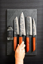 Dry your knife after each use to prevent rust. Oil the carbon steel using a food grade mineral oil. Avoid soaking & never put it in the dishwasher. For full care tips, visit: Knife Care Guide →