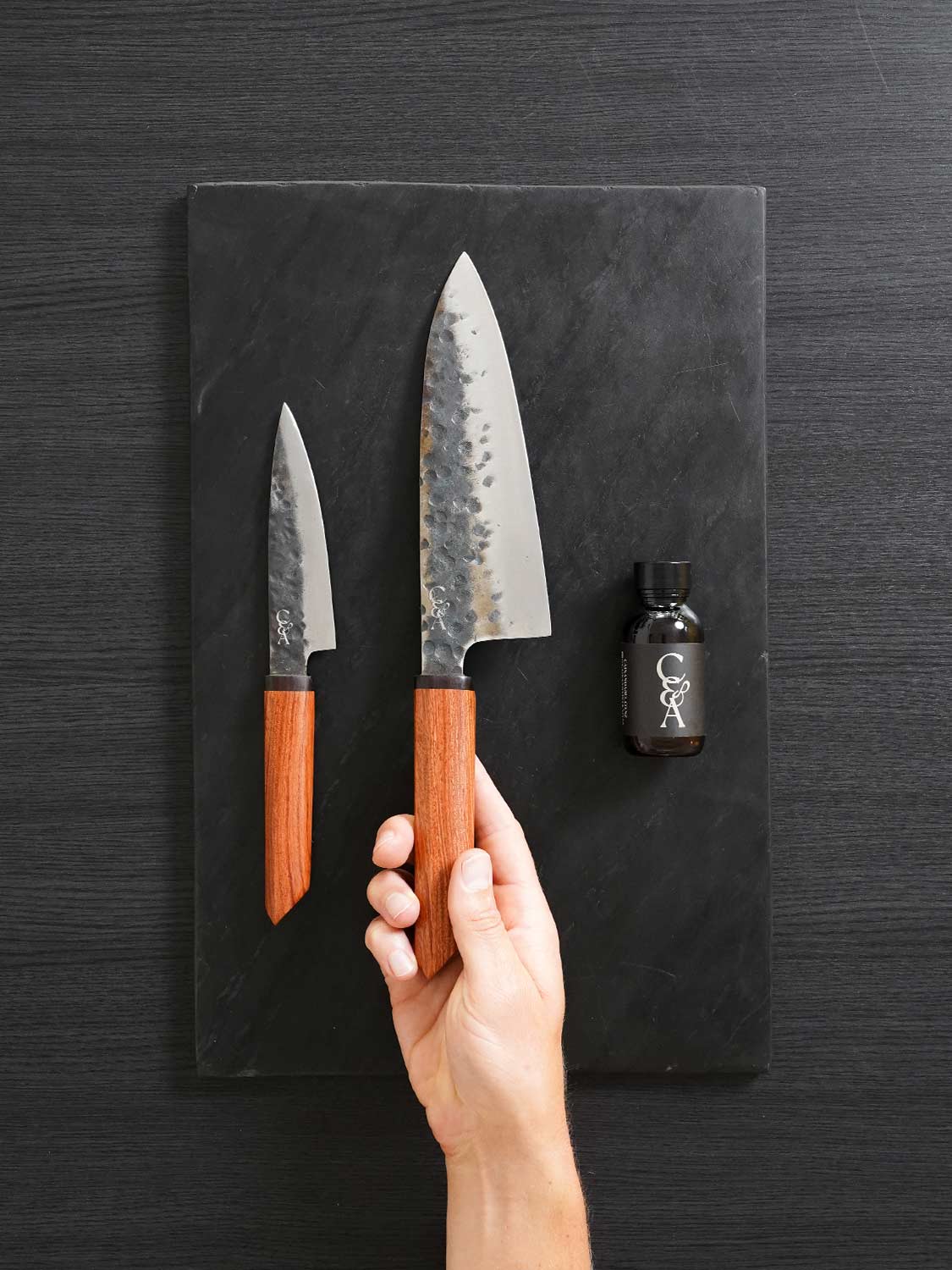 A bold pairing built for cooks who want it all. Zion brings the strength with a thick Deba blade that powers through chicken, root veg and anything that needs a heavier hand. Eve brings the finesse. A slim petty knife for precision cuts, delicate prep and the detail work that makes a meal. Together, they cover the full spectrum of your kitchen. Completed with a Mineral Oil for the best knife care.