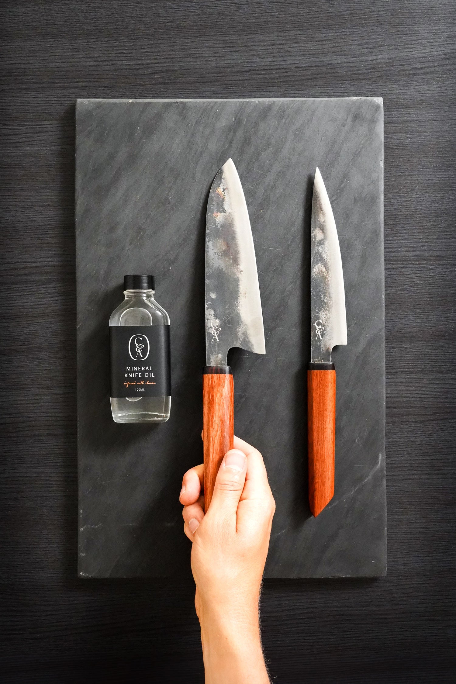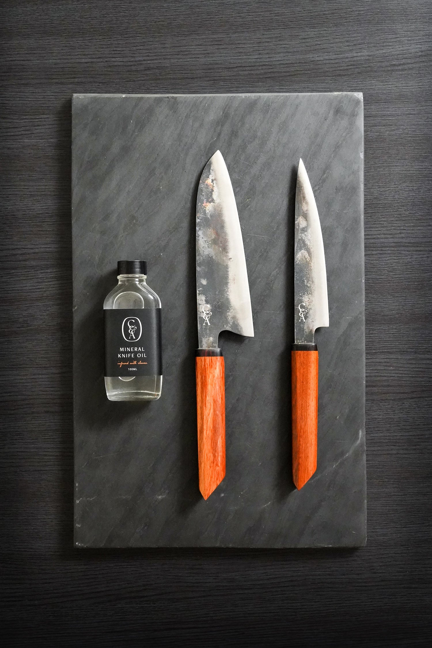 An ideal duo of of carbon steel knives to get your kitchen rolling. Includes our paring style knife, Jonathan paired perfectly with our medium santoku, Joseph. Completed with a Mineral Oil for the best knife care.