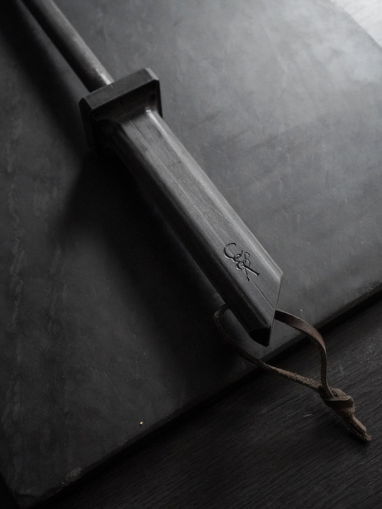 The handle is machined from solid black Acetal to match our signature knife shape. Then finished by hand with a cut and tied leather loop for hanging.