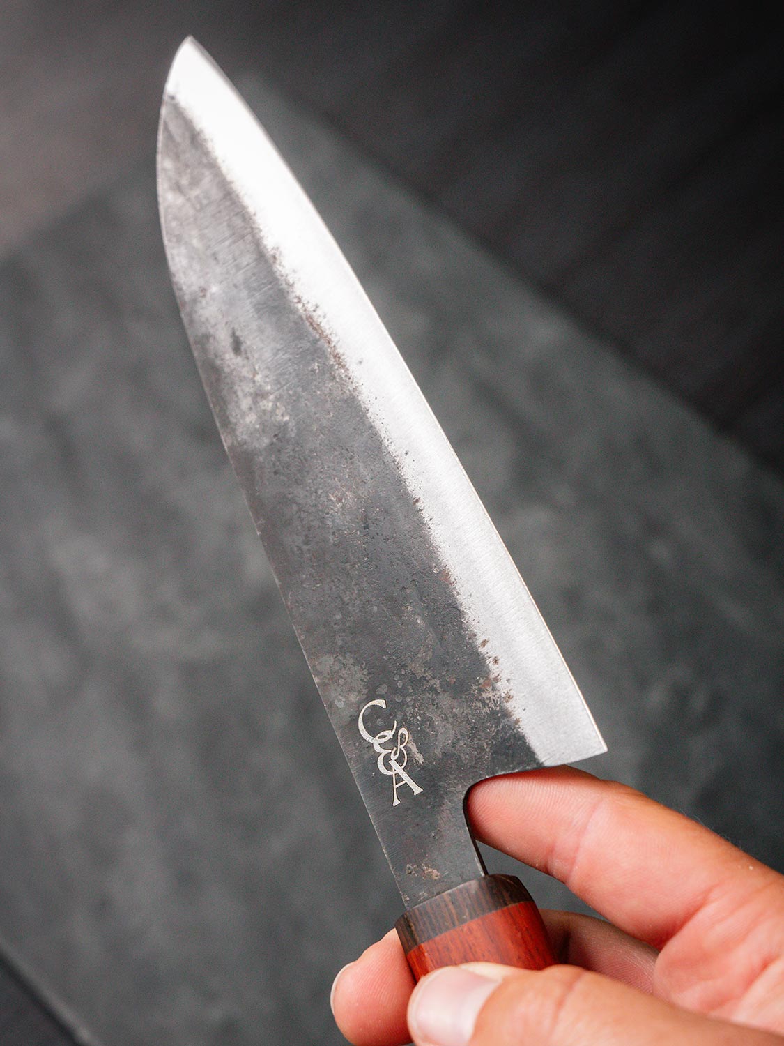 Dry your knife after each use to prevent rust. Oil the carbon steel using a food grade mineral oil. Avoid soaking & never put it in the dishwasher. For full care tips, visit: Knife Care Guide →