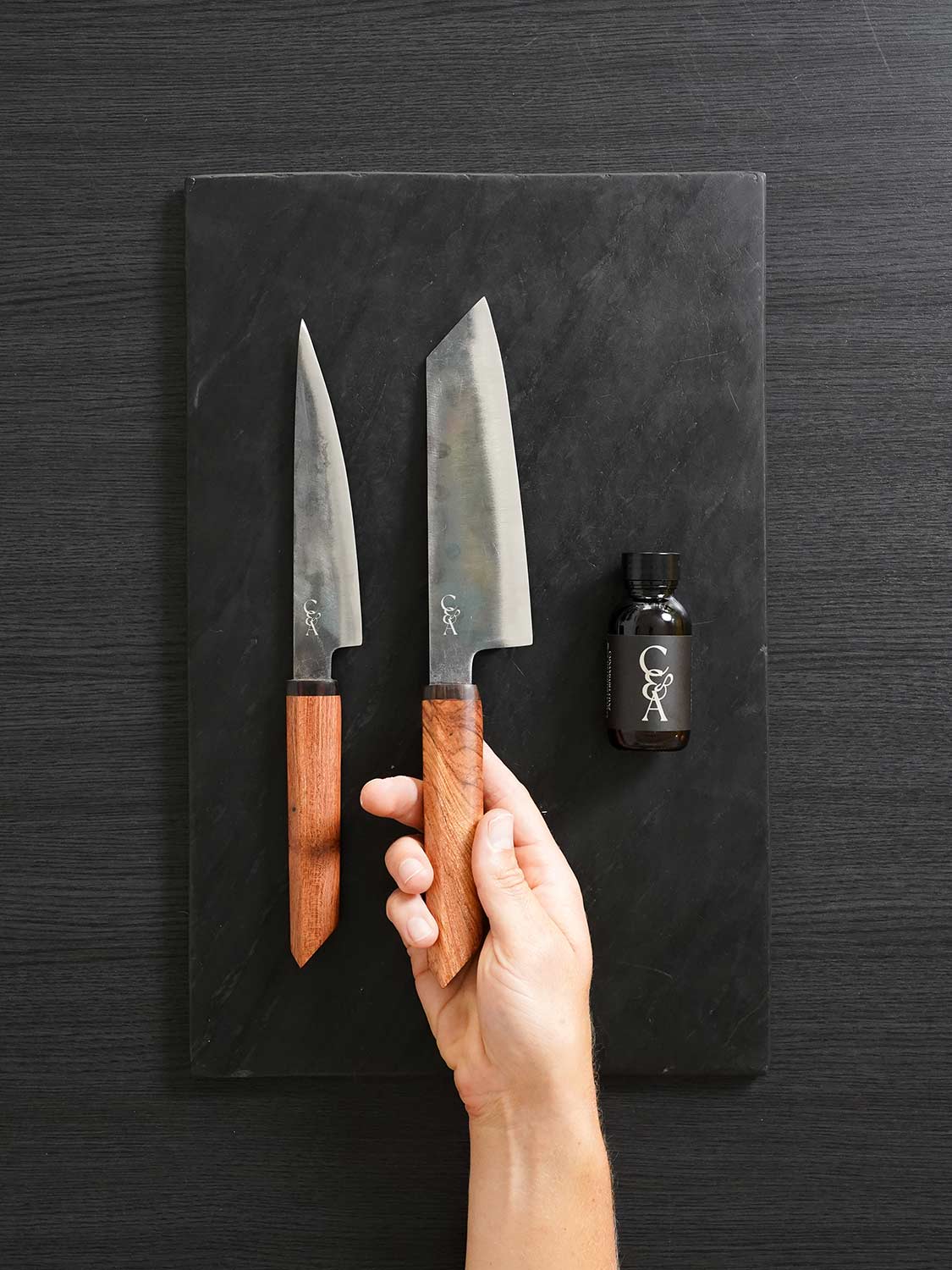 An ideal duo of of carbon steel knives to get your kitchen rolling. Includes our paring style knife, Jonathan paired perfectly with our medium bunka, Ezekiel. Completed with a Mineral Oil for the best knife care.